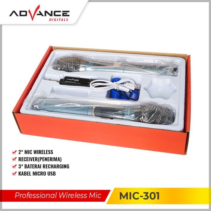 Advance MIC-301 Mic Wireless Double Microphone Mic ini dapat digunakan untuk speaker amplifier mixer dan sejenisnya dengan jack audio 6.5mm. Mic ini memiliki desain yang solid dan kokoh yang terbuat dari bahan besi.