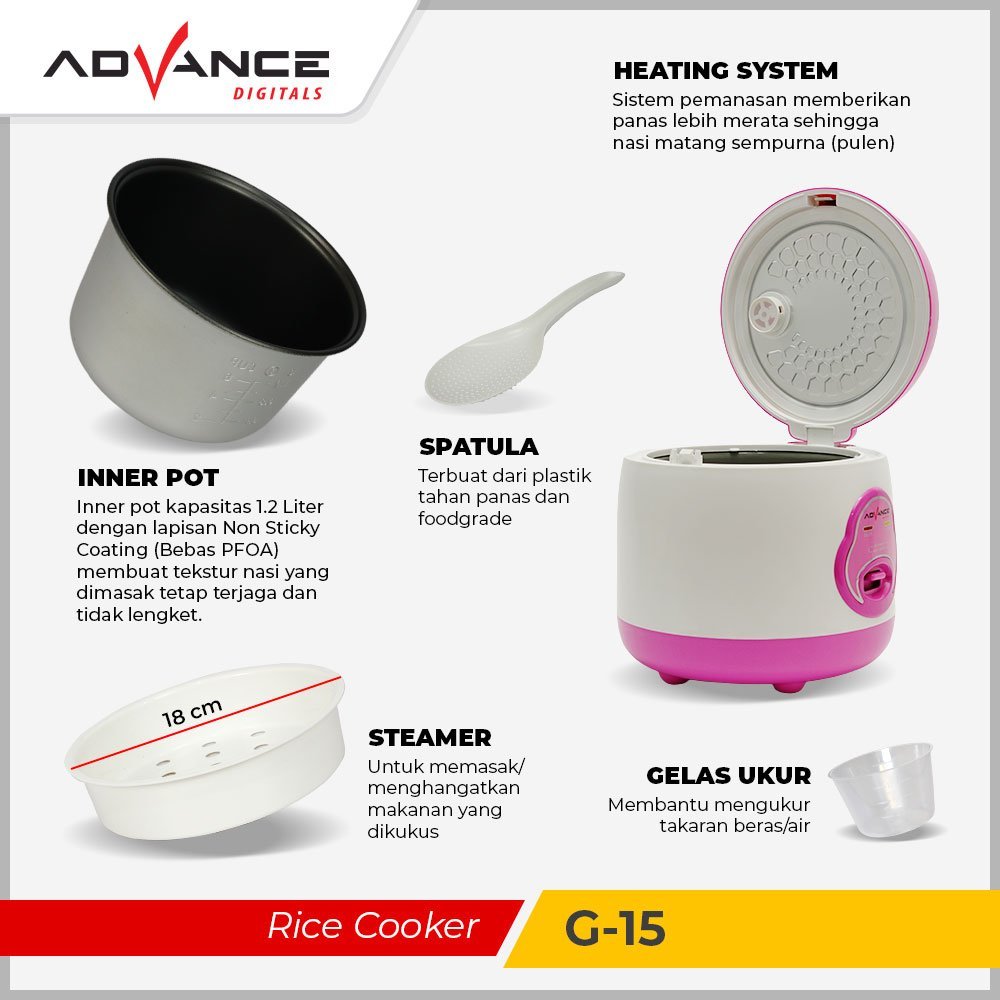Advance Rice Cooker G15 / G-15 Penanak Nasi Kapasitas 1.2 Liter Magic Com Bisa Untuk Mengukus Nasi Garansi 1 Tahun