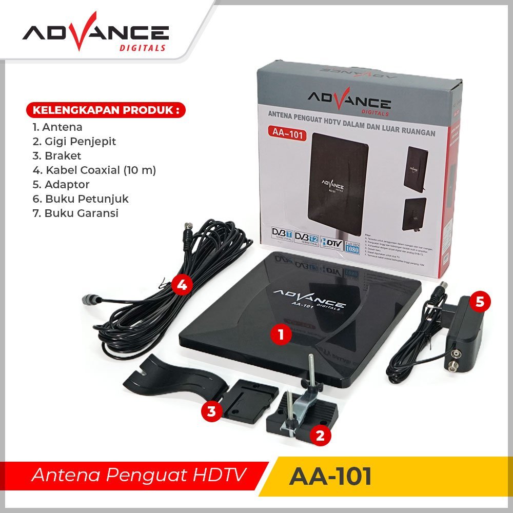 ANTENA Advance AA 101 adalah sebuah antena desain khusus untuk menerima sinyal digital terrestrial broadcasting. Dengan menggunakan teknologi dan sirkuit tingkat kebisingan rendah, akan memberikan daya terima sinyal yang baik. Dan desain yang menarik dan model yang bergaya, dimana akan bekerja sangat baik dengan STB (Set Top Box) Digital Anda.