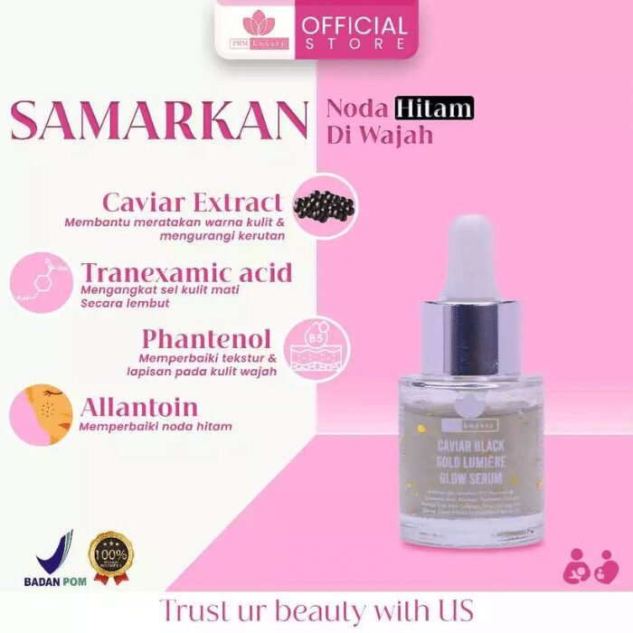 Caviar Black Gold Lumiere Glow Serum adalah serum yang membantu kulit glowing, kencang,kenya. Cocok banget kalau kamu mau hasil kulit kenyal sehat dan berkilau pakai serum ini. ‘Emas Hitam’ dari telur Ikan Sturgeon yang kaya akan mineral, asam amino, dan peptides yang penting untuk menutrisi kulit dan regenerasi kulit wajah.