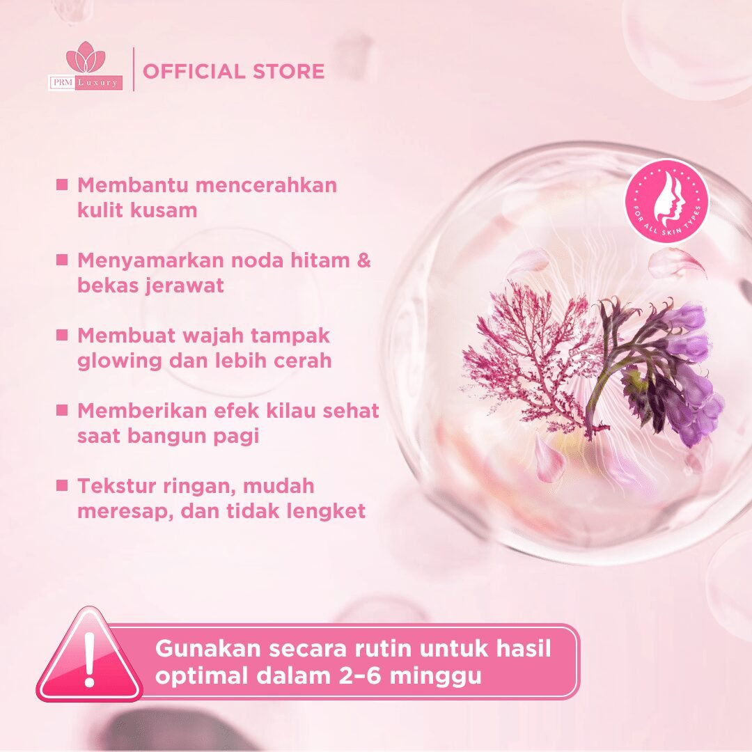 Meningkatkan Regenerasi Sel: Saat tidur, kulit melakukan proses regenerasi sel. Night cream PRM Luxury kaya nutrisi yang dapat mendukung proses ini, membantu mengembalikan kulit ke kondisi terbaiknya.
