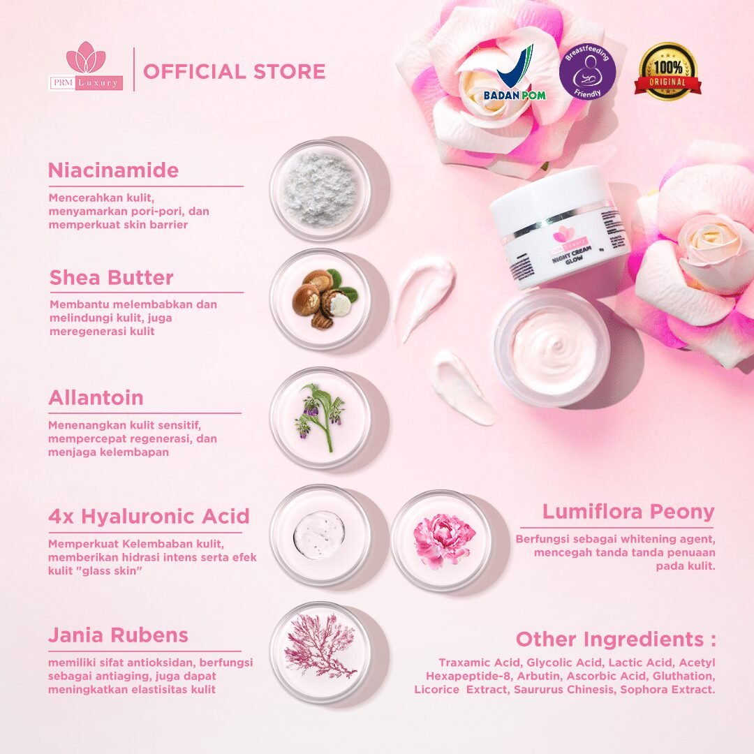 Night cream brightening PRM Luxury memiliki sejumlah manfaat yang sangat baik untuk kulit, terutama saat digunakan di malam hari.